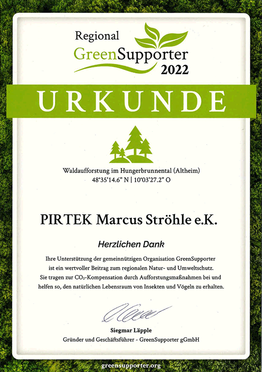 "Mit dem Projekt von GreenSupporter im Hungerbrunnental bei Altheim/Alb, geben wir weiterhin gerne einen wertvollen Beitrag zum regionalen Natur- und Umweltschutz", so Firmeninhaber Marcus Ströhle. Durch die Aufforstung tragen wir zur CO2 -Kompensation durch Aufforstungsmaßnahmen bei und helfen so, den natürlichen Lebensraum von Insekten und Vögeln zu erhalten.